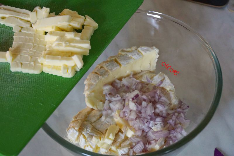 Sýr Camembert nakrájíme na kostičky. Dobrým pomocníkem je nůž na sýry. Kostičky sýra přendáme do misky a vidličkou ho jemně nadrtíme.
